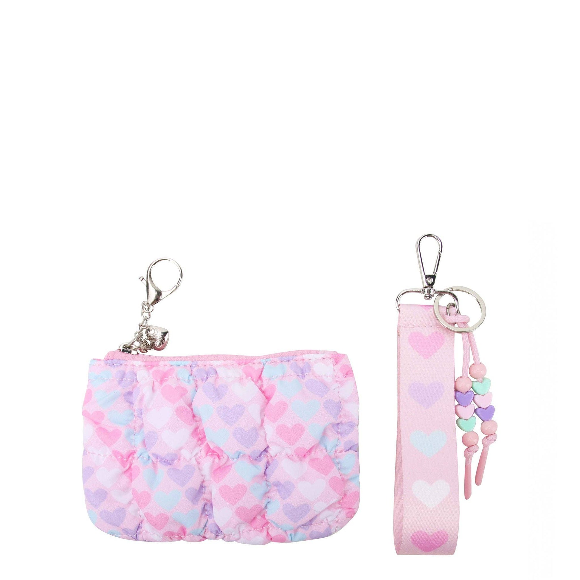 Accessorize your favorite bag with our newest two piece bag charm set featuring a quilted scrunchies light aqua floral bow print coin purse pouch and a detachable bow printed wrist strap for extra functionality - add it to a bag or wear it as a mini wristlet! Dimensions: 4.0625H X 4.625W